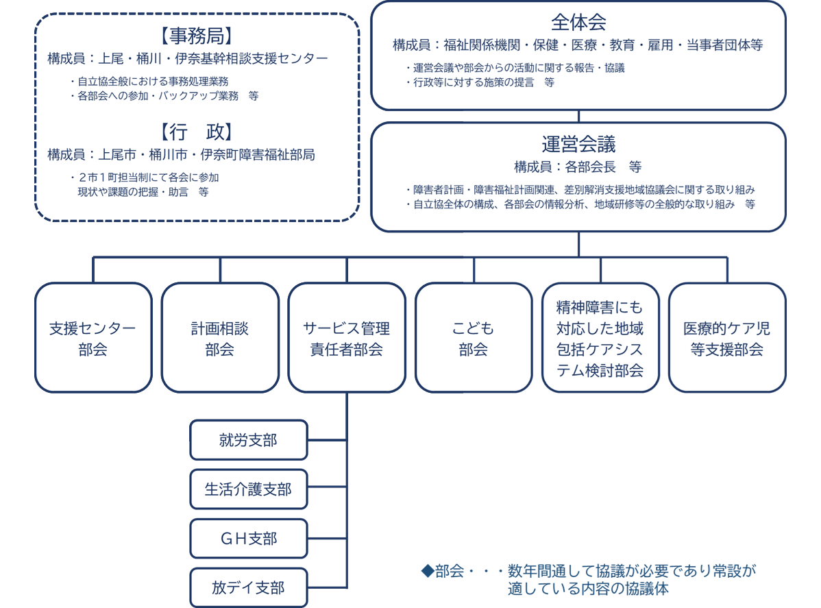 2市1町にある生活支援センター(相談支援センター)等および行政職員で構成され、協議会運営に係る企画立案や各部会で挙がった課題の分析などを行います。